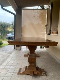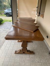 Vendesi tavolo allungabile in legno rovere massello come da foto. Larghezza 90 cm Lunghezza 180 cm Altezza 80 cm Dispone di 4 prolunghe da 40 cm l'una. Misura massima tavolo 360 cm Trattabile Filina