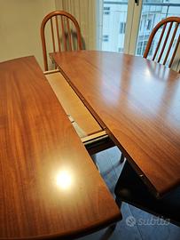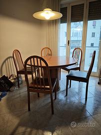 Vendo per inutilizzo tavolo da pranzo in legno, rotondo e allungabile, in ottime condizioni. Ritiro a carico dell'acquirente zona Vomero Napoli Dotato di prolunga centrale interna. •Diametro da chiuso: circa 110cm •Allungato: fino a circa 160-180 cm •Posti: 4 chiuso / 6-8 aperto •Colore: legno ciliegio/noce Incluso nel prezzo anche set di sedie coordinate.