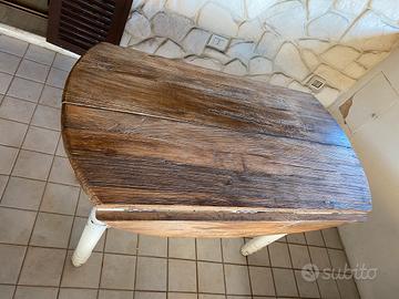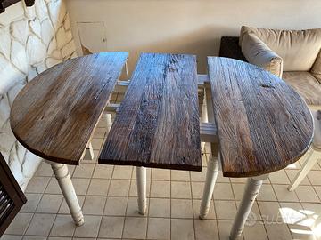 Tavolo tondo diametro 110cm, con ali ripiegabili per farlo diventare rettangolare, con 4 prolunghe da 45cm ognuna. Misura totale allungato 2,90 metri. Gambe color bianco shabby chic