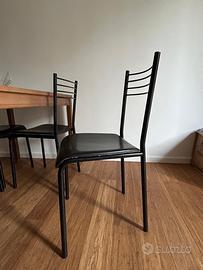 Il tavolo è in vero legno con piccoli segni di usura . La superfice in legno è verniciabile . Le sedie hanno una struttura in metallo con seduta e schienale in pelle nera molto elegante .