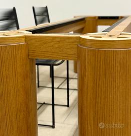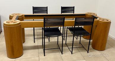 Elegante tavolo in legno massello con grosse gambe cilindriche, arricchito da un vetro molato di alta qualità. Perfetto per sale da pranzo moderne o ambienti di design, con la possibilità di acquistare anche le sedie anni ’70 modello “spaghetti” per completare l’insieme.