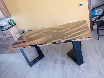 Vendo splendido tavolo artigianale realizzato in legno d’olivo massello e resina epossidica trasparente grigio fumé.