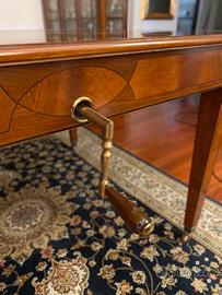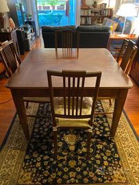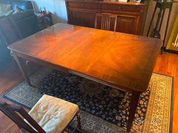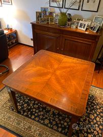 Si vende tavolo in ottimo stato in legno di noce e piano in piuma di noce, con dimensioni 110x110 cm ed altezza 78 cm. Il tavolo è allungabile con l'ausilio di due piani in legno da 36 cm, raggiungendo una lunghezza finale del tavolo di 182 cm, utilizzando un sistema a vite senza fine e manovella. Oltre al tavolo sono incluse le 4 poltroncine in buono stato, sempre in legno di noce e con imbottitura sulla seduta.