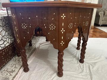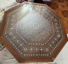 Vendo ottimo tavolo da salotto in legno di Noci come nuovo. Presenta la superficie di vetro pesante con rifinizioni decorate a mano.