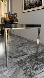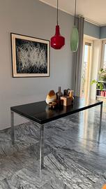 Tavolo nero laccato in legno, con struttura e zampe in acciaio. Ottime condizione, facile da lavare. Misure 1,70cm di lunghezza x 85 cm di larghezza