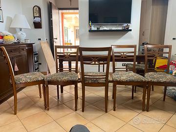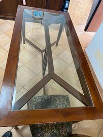 Tavolo sala in legno di noce con piano in cristallo molato e 6 sedie imbottite