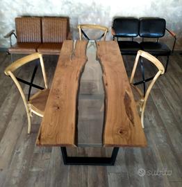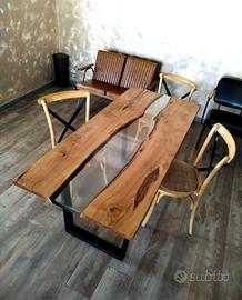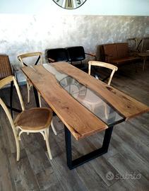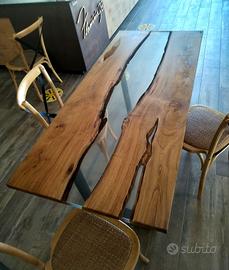 tavolo in legno di castagno e resina trasparente. Creazioni di tavoli su misura in legno e resina. Tutti i tavoli sono fatti artigianalmente e quindi ognuno è un pezzo unico. La lavorazione, dalla scelta del legno adatto, al disegno e scelta del colore della resina, fino alla lucidatura finale è curata nei minimi dettagli per garantire il risultato gradito al cliente. Posso eseguire tavoli di qualsiasi misura su ordinazione. Contattandomi vi seguirò con piacere concretizzando l' idea che avete del vostro River table. Spedizione in tutta Italia.