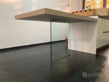 Piano in legno chiaro spesso e robusto, con sostegno centrale in vetro temperato che dona leggerezza ed eleganza.