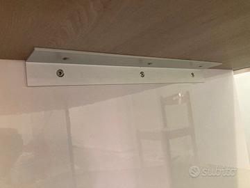 Il tavolo viene facilmente fissato (sul lato corto) a un muro o a bancone, tramite elemento metallico (vedi foto). Il sostegno in vetro, l'elemento metallico e le relativi viti sono comprese nel prezzo.