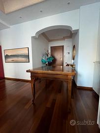 Legno noce molto lucido e di ottima fattura. Tavolo d'epoca, snello ed elegante, ideale per famiglie numerose grazie alla sua estensibilità. Altezza 80 cm, Lunghezza lato quadrato 100 cm. Esteso, diventa un rettangolo di 200x100 cm.