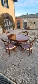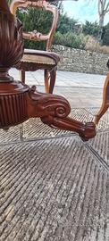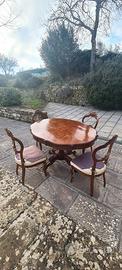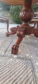 Vendo tavolo rotondo antico in legno massello, stile fine Ottocento / primi Novecento, sedie vendute a parte. Il tavolo presenta: * fusto centrale intagliato * zampe scolpite a forma di leone * piano sagomato con lavorazione decorativa * legno massello e struttura originale Il tavolo è da restaurare. La struttura è completa ma presenta un leggero traballamento e il piano tende a ruotare, difetti comuni nei tavoli antichi a fusto centrale. Restauro di tipo conservativo. Prezzo moderatamente trattabile.