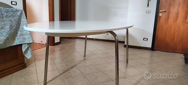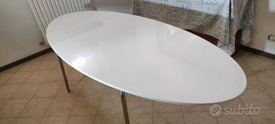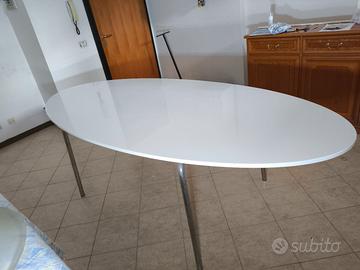Svendo per liberazione di appartamento un tavolo in legno bianco laccato, dalla particolare forma di tavola da surf. Misure, ingombri massimi: lunghezza cm 210 larghezza (centrale) cm 105 altezza cm 78. Gambe in acciaio inox. Adatto per soggiorni, cucine, sale riunioni... Usato pochissimo: come nuovo. Ritirabile in autonomia in località Vigatto a pochi km dal centro di Parma. Prezzo € 120.