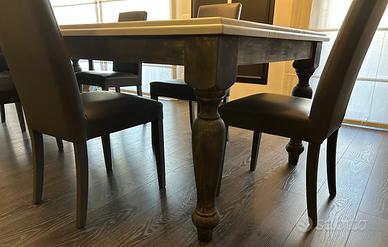 Tavolo in legno massello 245x120 cm con 6 sedie. Il tavolo si presenta in modo imponente, originariamente di legno chiaro è stato pitturato a mano donando alle gambe un effetto grigio anticato e al piano un colore bianco ghiaccio. Il legno è in ottimo stato.