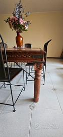 Vendo splendido tavolo in stile etnico, realizzato in legno massello con dettagli artigianali intagliati e inserti in metallo. Un pezzo solido e di grande carattere, perfetto per dare personalità alla zona pranzo o a un ambiente open space. Il tavolo è accompagnato da 6 sedie coordinate con struttura in metallo e rivestimento in pelle effetto elefante, robuste e confortevoli, con finiture curate. Caratteristiche principali: Tavolo in legno massello, molto stabile struttura rinforzata con elementi in metallo. Stile etnico / rustico-industriale Condizioni: ottime, come da foto Ideale per: sala da pranzo, taverna, casa di campagna o ambienti dallo stile ricercato Disponibile per visione e ritiro.