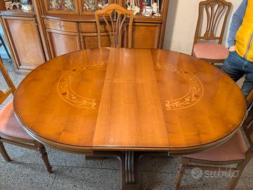 Tavolo in legno massello allungabile tramite parte interna in legno. Incluse 6 sedie coordinate con cuscino rifoderato recentemente. Leggere imperfezioni sulle gambe del tavolo date dall'utilizzo. Ritiro a carico dell'acquirente.