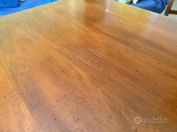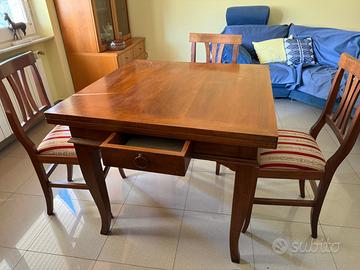 Vendo per inutilizzo tavolo in legno massello di noce 90x90 allungabile 180x90 con sedie imbottite e cassetto. Leggerissimi segni di usura come in foto. In ottime condizioni.