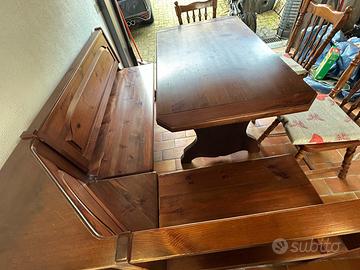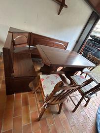 Vendo tavolo in legno massello molto robusto con panca angolare contenitrice e tre sedie Mobile molto robusto, con finitura color noce e caratteristici nodi del legno. Ideale per cucina, taverna o casa di montagna. Le panche hanno pratico vano contenitore sotto la seduta, molto comodo per riporre tovaglie o altri oggetti. Dimensioni tavolo: - Lunghezza: 140 cm - Larghezza: 79 cm - Altezza: 77 cm Dimensioni panca angolare: - Lato lungo: 189 cm - Lato corto: 128 cm - Altezza totale: 90 cm - Altezza seduta: 46 cm Compreso tavolo e 3 sedie. Una sedia presenta piccoli segni sui piedini causati dal cane quando era cucciolo, ma rimane perfettamente stabile e utilizzabile. Possibilita di visionarla Ritiro a mano PREZZO TRATTABILE