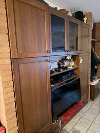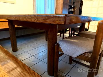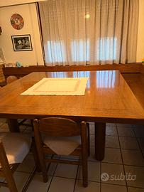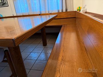 Vendo bellissimo set area pranzo in legno massello composto da: - Tavolo gigante quadrato molto robusto. Dimensioni 180x180 - Spessore 5 cm - Panche ad angolo su misura (fissa a parete con schienale). Dimensioni 300x300 - 4 sedie coordinate con seduta imbottita - 2 Prolunghe per tavolo da 80 cm ciascuna Il mobile è in ottime condizioni, molto solido e stabile. Finitura lucida ben conservata, con normali segni di utilizzo. Ideale per cucina o taverna, perfetto per ambienti rustici o classici. Per chi fosse interessato c'è in abbinata una mobile da salotto come da foto (prezzo a parte) e eventualmente anche pensili della cucina. Prezzo speciale per acquisto in blocco.