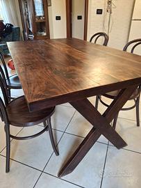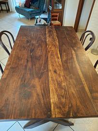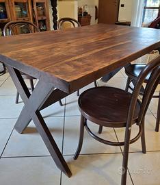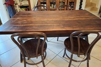 Vendo bellissimo tavolo in legno massello, molto solido e robusto, in ottime condizioni. Il piano presenta una venatura naturale molto caratteristica e calda, con finitura scura. Struttura con gambe a X, stabile e di design. Dimensioni tavolo: -Lunghezza: 160 cm -Larghezza: 100 cm -Altezza: 80 cm Adatto comodamente a 6 persone Insieme al tavolo vendo anche 4 sedie in legno stile bistrot, leggere ma resistenti, in buone condizioni. Prezzi: avolo + 4 sedie: 560 € trattabili Solo tavolo: 520 € trattabili Possibilità di vendita separata Il tutto è in ottimo stato, pronto all’uso. Ritiro a carico dell’acquirente. Per qualsiasi informazione o altre foto, contattami pure.