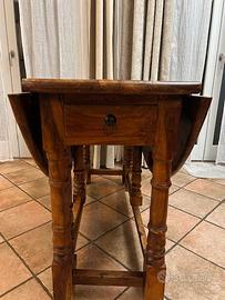 Piano in tre sezioni con due cassetti laterali. Le gambe tornite con traverse garantiscono solidità e stabilità anche a tavolo aperto.