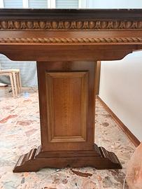 Vendo tavolo in legno massello di alta qualità, stile classico, con gambe a plinto e fregi intagliati lungo il bordo del piano.