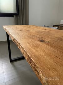 Tavolo da pranzo in legno massello stile industrial, di grande presenza scenica, ideale per ambienti moderni, loft o case dal carattere caldo e contemporaneo. Il piano, lungo 240 cm e largo 80 cm, è realizzato in legno massello con finitura naturale che valorizza le venature, i nodi e le imperfezioni autentiche del materiale. Il bordo effetto “taglio vivo” dona un aspetto unico e materico, rendendo ogni tavolo diverso dall’altro. La struttura è in ferro verniciato testa di moro, con gambe robuste e stabili che garantiscono solidità e durata nel tempo, oltre a un design pulito ed essenziale. Il tavolo è in ottime condizioni, utilizzato poco e sempre in ambiente interno. Non presenta difetti strutturali, solo i naturali segni del legno che ne esaltano il carattere. Perfetto per ospitare comodamente 8 persone.