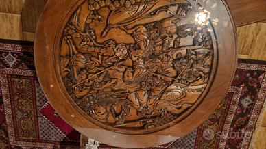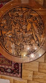 tavolo scolpito a mano con soggetto caccia vetro sopra e 4 sgabelli