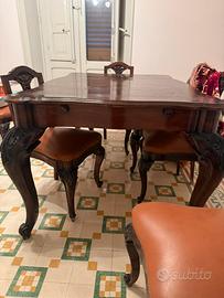 Tavolo antico in vero legno massiccio con sei sedie le misure del tavolo sono nelle foto lunghezza 1,46 larghezza 1,04 altezza 0,84 cm formula visto e piaciuto,disponibile a visione solo da lunedi a venerdì il primo che lo ritira lo do. A 200€ copreso di sedie smontaggio e trasporto a vostro carico x info pietro , il tavolo e a primo piano.