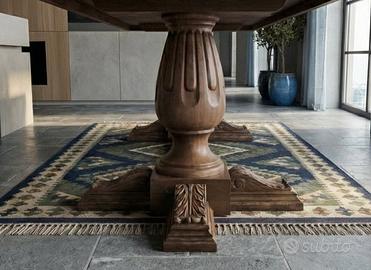 Il tavolo si distingue per il suo stile classico ed elegante, caratterizzato da un doppio basamento centrale a colonna con piedi lavorati e dettagli intarsiati che garantiscono massima stabilità e un forte impatto estetico. Il piano è spesso e presenta una finitura lucida ben tenuta.
