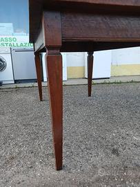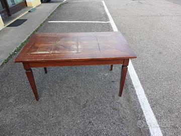 Elegante set da pranzo composto da tavolo in legno massiccio con piano decorato a intarsio geometrico e 6 sedie coordinate. Il tavolo è solido e robusto, con finitura color noce e gambe lineari. Presenta normali segni del tempo che ne evidenziano il fascino vintage; con una semplice levigatura e verniciatura può tornare come nuovo. Le sedie sono in legno, con schienale a listelli e seduta in paglia intrecciata, comode e resistenti, in buone condizioni generali. Ideale per sala da pranzo, taverna o casa di montagna.