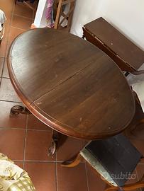 Tavolo in ottimo legno ovale allungabile, presenti due prolunghe per allungare il tavolo, entrambe con il legno visibilmente sciupato ma perfettamente funzionanti. Una è quella nell'ultima foto, l'altra è ancora più grande (si possono unire) e ha anche un'ulteriore gamba di supporto del peso (foto su richiesta, devo andare in garage).