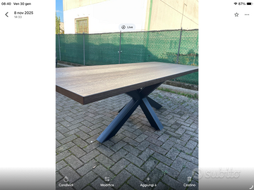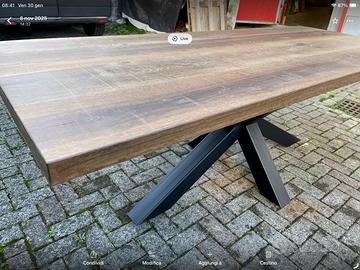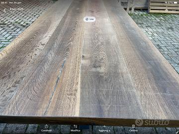 Tavoli in legno di rovere trattati con finiture particolari, la finitura è molto resistente, si possono avere con gambe o solo top di legno , la lunghezza 200/220 cm x larghezza 85/92 spessore 5 cm , i prezzi in base al modello varia da 800 solo top a 1200 con gambe,, consegna gratuita entro 50 km