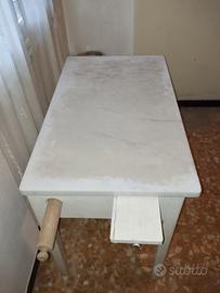 Tavolo con struttura in legno verniciata di bianco con piano in marmo di carrara pezzo d'arredo che richiama lo stile delle vecchie cucine italiane (spesso definito "arte povera" o stile rustico/vintage), caratterizzato da una struttura funzionale composta da due cassetti un mattarello un tagliere e un piano estraibile ideale per impastare un E un pezzo molto versatile: potrebbe essere usato come isola in una cucina moderna per dare un tocco vintage, o persino come scrittoio originale in un ambiente luminoso.