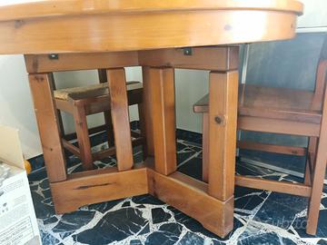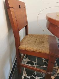 Tavolo rotondo in legno Pino di Svezia Berloni, con diametro 113cm e allungabile. Completo di 4 sedie lisce sempre in legno e 4 sedie impagliate sempre in legno