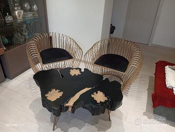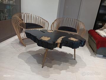 Tavolo in legno più 2 sedie di design con elegante effetto dorato.