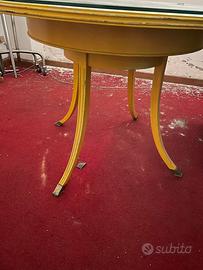Tavolo tondo in vero legno, verniciato in giallo. Le maioliche sono un adesivo che e possibile rimuovere. È possibile rimuovere anche il vetro