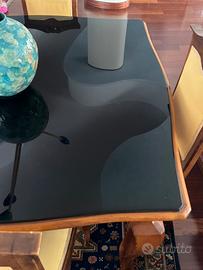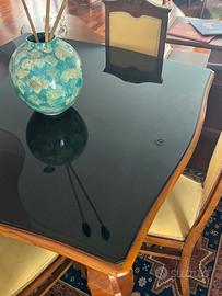 Tavolo in legno con gambe mosse e sagomate tipiche degli stili ottocenteschi.il piano è protetto da un vetro nero che aggiunge un tocco di modernità o protezione alla superficie originale. Le sedie abbinate presentano uno schienale a giorno con una traversa orizzontale e sedute imbottite di colore giallo chiaro.
