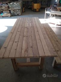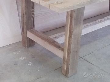 Tavolo costruito con legno di abete vecchio recuperato da solai o parancole da muratore leggermente levigate in modo che siano morbide al tatto mantenendo la pattina originale naturale che il tempo ha fatto con lunghezza 300 larghezza 110 altezza 79. le tavole sono distanziate tra loro di circa 0,8 mm e sono tenute unite l'una all'altra tramite una fresata sotto al piano fatta a V e inserito il legno massello di faggio in modo da mantenerle più dritte possibile nel tempo. le gambe sono staccabili dal piano da 10 x 10 con pattina in tutti i lati e smontabile le une dall'altra tramite intraverso longitudinale che da stabilità alla tavola. il piano è di spessore 4 circa. Il tutto con finitura effetto grezzo naturale trasparente impermeabile neutra che non alteri il colore. Iva non comprendente, costruito su commissione, non è disponibile a magazzino ma possiamo riprodurlo DIRETTAMENTE DAL PRODUTTORE ASTENERSI RIVENDITORI O COMMERCIANTI