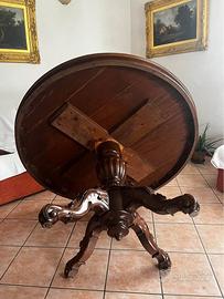tavolo rotondo in legno Misure: 132 cm di diametro e 82 cm di altezza. Il tavolo ha lavorazioni floreali sulle gambe e colonna. Da ritoccare/ristrutturare (si veda le ultime 2 foto