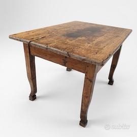 Tavolo in legno con un design rustico che ricorda lo stile delle fattorie. - Piano del tavolo con finitura invecchiata. - Gambe tornite e dettagli lavorati. - Restaurato - Misura H 79 L 120 P 84