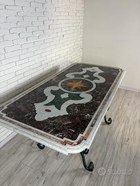 Tavolo in marmo dei primi del ’900, caratterizzato da una fantasia decorativa con pregevoli intarsi in diversi marmi e granito. Il piano poggia su una struttura in metallo battuto a mano, recentemente sostituita, solida e ben proporzionata.