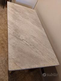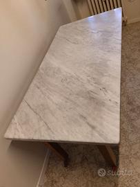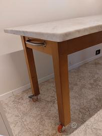 Tavolo in marmo di carrara, gambe in legno massello, maniglie e rotelle per facilitare gli spostamenti. Misure: lunghezza cm 149,5 larghezza cm 75, altezza cm 73,5. Vendo a €150 trattabili, consegna e trasporto a carico dell'acquirente.