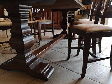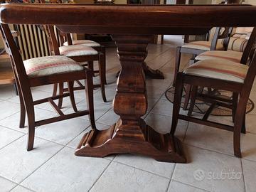 Tavolo dei primi del 900, unico pezzo in marmo di Carrara intarsiato, realizzato artigianalmente a mano, con gambe in noce, dimensioni 250cm x 95 e 6 sedie damascate. Adatto per saloni per cucine, uffici, di edifici storici, ville antiche castelli.