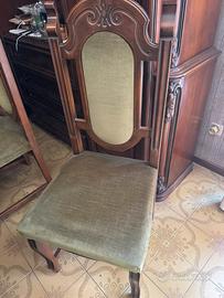 Le sedie abbinate hanno schienale alto con dettagli decorativi e seduta imbottita in tessuto verde, comode e ben tenute.
