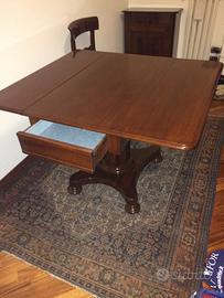 Tavolo in Mogano, con colonna centrale, dotato di ruote ed un cassetto, fine Ottocento per Sala da Pranzo con 2 sedie. Misure (cm): 94 x 104 (aperto). Ottime condizioni.