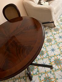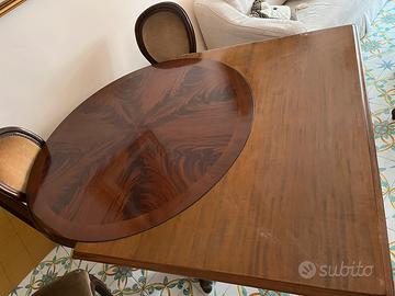 Tavolo rotondo allungabile in piuma di mogano.