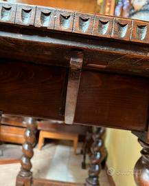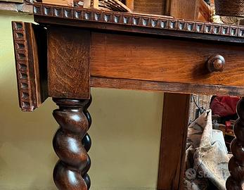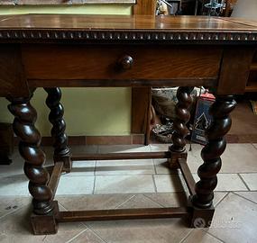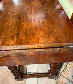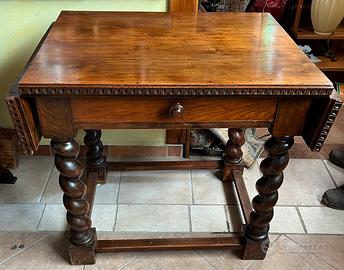 tavolo in massello di noce del periodo georgiano , risalente all'inizio del XIX secolo, è un mobile antico con gambe a tortiglione e un piano allungabile grazie a delle alette laterali (bandelle) si trasforma in un comodo tavolo da pranzo rettangolare e anche un ampio cassetto. Restaurato Misura lung. aperto 1.10 x 78 chiuso x prof 60 x alt 77