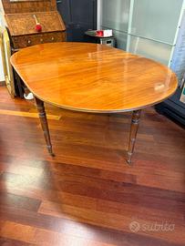 Elegante tavolo ovale fine '800 in noce chiaro lucido con bandelle e rotelle.