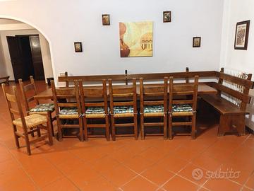 Misure tavolo/ larghezza 80 cm. Lunghezza 3 metri. Altezza 80cm. Misure cassapanca grande /lunghezza 3metri 50 cm. Altezza 1metro 0,5 cm. Misure cassapanca piccola!/lunghezza 1metro e 35cm.altezza 1 metro 0,5cm. Numero sedie 7