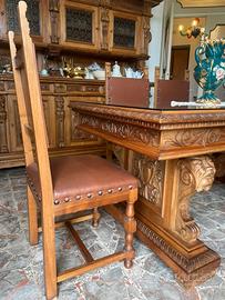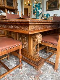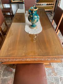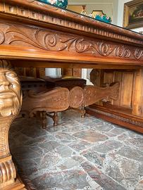 Tavolo Monumentale "a Fratino" in Noce Massello – Capolavoro d’Intaglio Artigianale Vendesi imponente tavolo rettangolare "a fratino" in pregiato noce massello, un pezzo d'arredamento di straordinaria presenza scenica e alta ebanisteria realizzato artigianalmente. Il tavolo poggia su un robusto basamento a doppia colonna, arricchito da maestosi mascheroni e volute intagliati a mano nel legno pieno. Piano in Noce Superiore: Il piano mostra una venatura del legno calda e profonda, protetta da un cristallo sagomato su misura, che ne ha preservato l'integrità totale nel tempo.• Stato Impeccabile: Il mobile è in condizioni eccellenti, privo di graffi, macchie o segni di usura. Dimensioni:• Lunghezza: 192 cm• Profondità: 93 cm• Altezza: 90 cm (inclusa protezione in cristallo) Note per l'acquirente: È disponibile, su richiesta, anche il set di sedie coordinate in pelle borchiata e la credenza a doppio corpo appartenente alla stessa serie, per un arredamento completo e stilisticamente coerente.